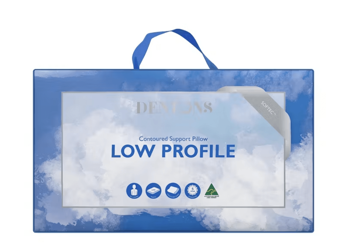 The Dentons Low Profile pillow is made from moulded Softec™️. It is designed for both side and back sleepers who have a small-medium frame and prefer a low, dual height pillow.
