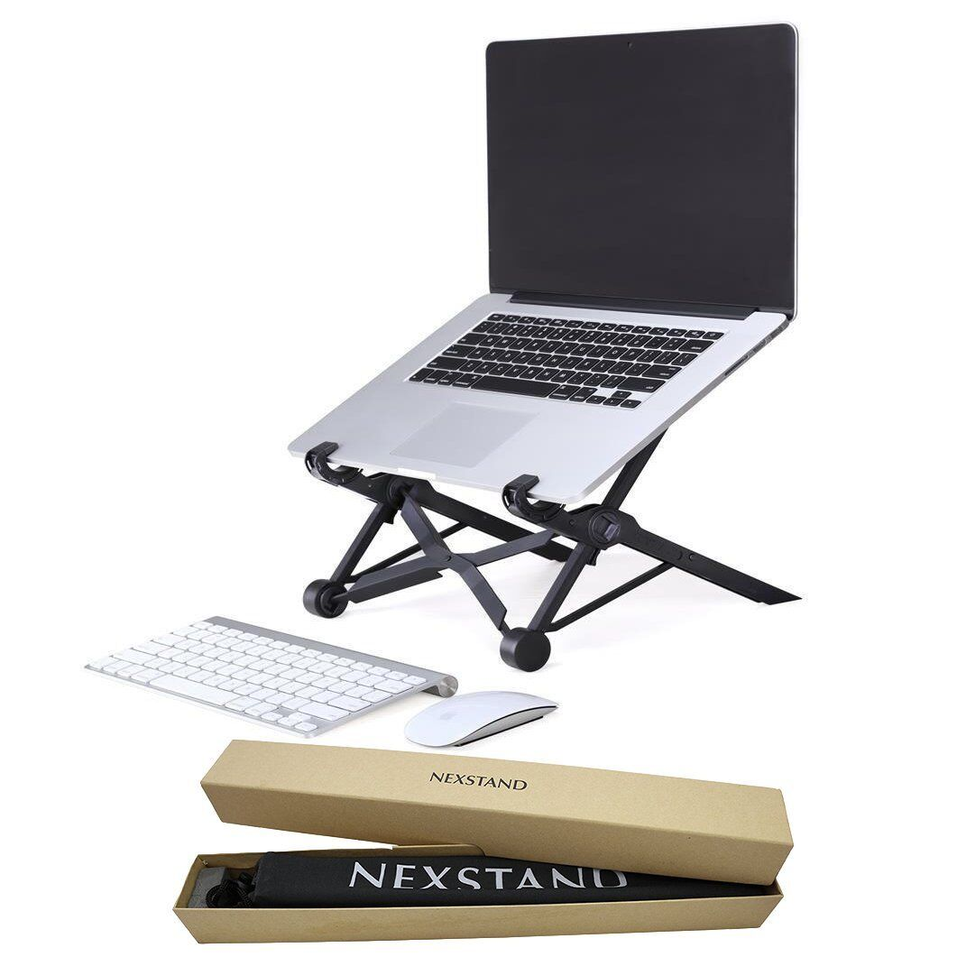 during business trips. Its adjustable height helps position your laptop screen at eye level, reducing back and neck strain for improved
